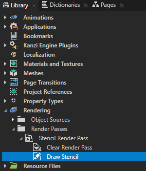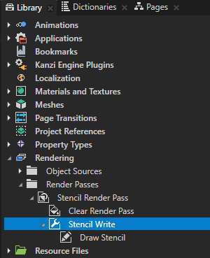 - 在素材库 (Library) > 渲染 (Rendering) > 渲染通道 (Render Passes) > Stencil Render Pass 中创建管道状态渲染通道 (Pipeline State Render Pass),命名为Stencil Write,并将Draw Stencil 渲染通道拖到Stencil Write 渲染通道。
