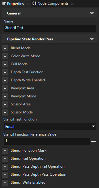 - 在素材库 (Library) > 渲染 (Rendering) > 渲染通道 (Render Passes) > Stencil Render Pass 中选择Stencil Test,在属性 (Properties) 中添加并设置: