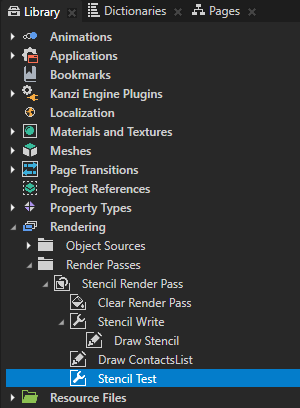 - 在素材库 (Library) > 渲染 (Rendering) > 渲染通道 (Render Passes) > Stencil Render Pass 中创建管道状态渲染通道 (Pipeline State Render Pass),命名为Stencil Test,并将Draw ContactsList 渲染通道拖到Stencil Test 渲染通道。