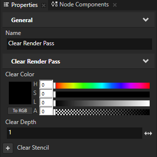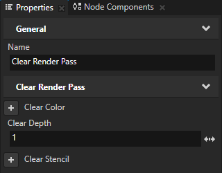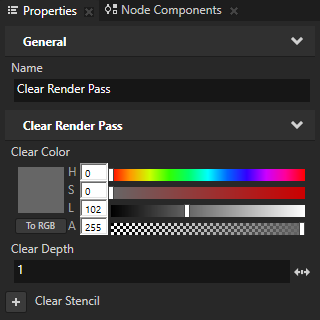 4. (可选) 要设置您要渲染其内容的 场景 (Scene) 节点的 视口 (Viewport) 父节点的背景,在您创建的 默认渲染通道 (Default Render Pass) 中选择 清除渲染通道 (Clear Render Pass),并在 属性 (Properties) 中添加和设置 清除颜色 (Clear Color) 属性。