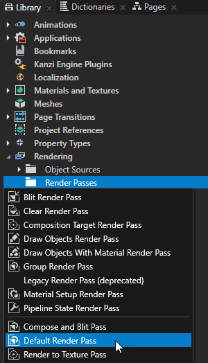 1. 素材库 (Library) > 渲染 (Rendering)按下 Alt 并右键点击 渲染通道 (Render Passes)并选择默认渲染通道 (Default Render Pass)
