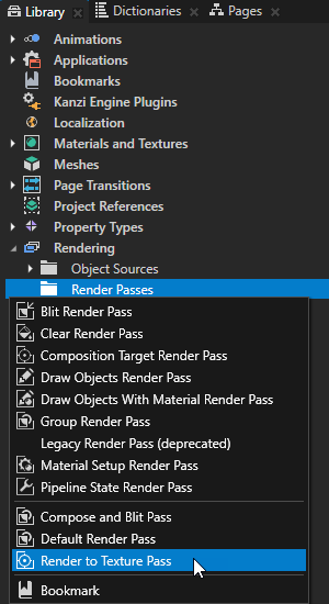 1. 素材库 (Library) > 渲染 (Rendering)按下 Alt 并右键点击 渲染通道 (Render Passes)并选择渲染到纹理通道 (Render to Texture Pass)