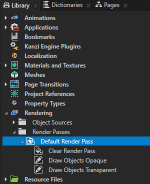 使用渲染通道来定义 Kanzi 应用程序中节点的渲染。 每个场景 (Scene) 节点中都有确定 Kanzi 使用哪个渲染通道渲染场景 (Scene) 节点的渲染通道 (Render Pass) 属性。在创建场景 (Scene) 节点时,节点使用DefaultRenderPass 来渲染其内容。 要定义应用程序中的节点渲染,请创建您所需要的渲染通道的层级。