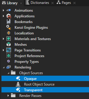 Kanzi Studio素材库 (Library) > 渲染 (Rendering) 中创建先渲染不透明节点、然后再渲染透明节点所需的过滤器和渲染通道: