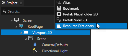 要向某个节点添加资源字典,在 工程 (Project) 中按下 Alt 并右键点击某个节点并选择 资源字典 (Resource Dictionary)。