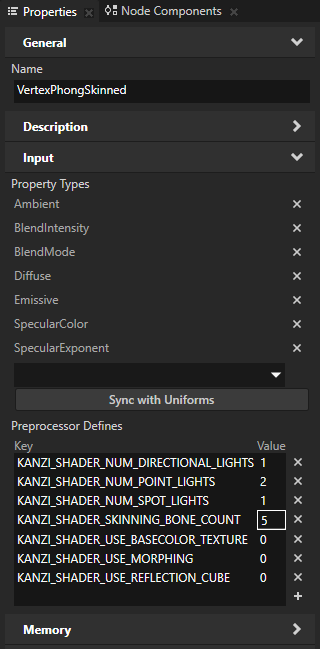 - 在属性 (Properties) 中将预处理器定义的KANZI_SHADER_SKINNING_BONE_COUNT 的值 (Value) 设为蒙皮网格使用的骨架数量并按下 Enter 键。
