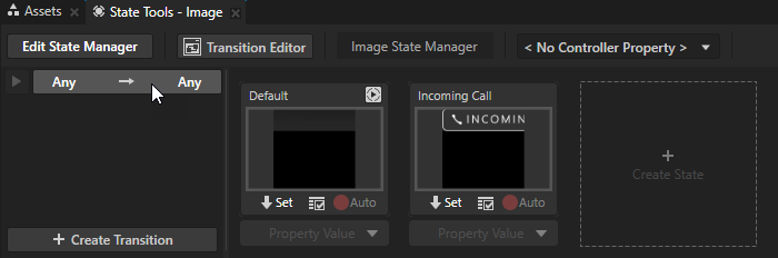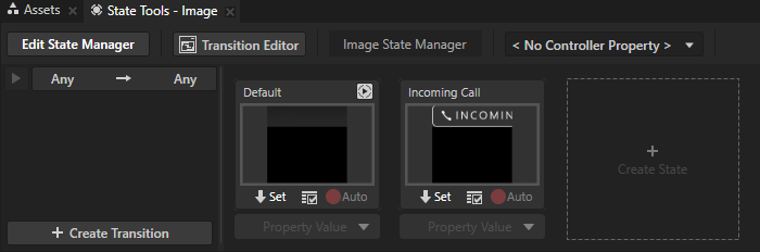 - 为图像 (Image) 节点创建具有一个状态组(含 Default 和 Incoming Call 状态)的状态机,为每个状态添加并设置图像 (Image) 节点的不透明度 (Opacity) 属性值: