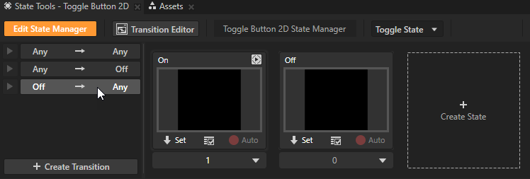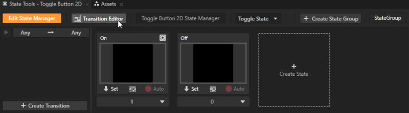 例如,创建切换按钮和拥有包含状态 On 和 Off 的状态组的状态机。 - 在状态工具 (State Tools) 中点击迁移编辑器 (Transition Editor) 打开状态迁移编辑器 (State Transition Editor)。