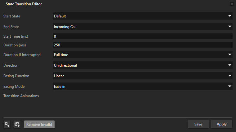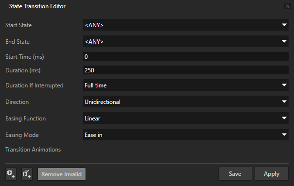 - 配置动画 (Configure Animations) 让您能够进一步定义迁移的详细信息。在状态迁移编辑器 (State Transition Editor) 窗口中设置: