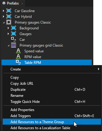 当在屏幕 (Screen) 节点上使用添加资源至主题组 (Add Resources to a Theme Group) 命令时,您可以使用 Kanzi Studio 将工程中的所有资源添加到主题组 (Theme Group) 并更改其在各主题 (Theme) 中的外观。要只将所选节点或预设件及其节点树的资源添加到 主题组 (Theme Group),右键点击节点或预计件并选择 添加资源至主题组 (Add Resources to a Theme Group)。