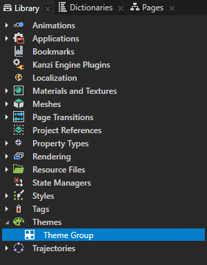 Kanzi 通过含各主题 (Theme) 单独值的资源 ID 间接使用已制定主题的资源。在素材库 (Library) > 主题 (Theme) 中,您可以看到 Kanzi Studio 工程中的所有主题组 (Theme Group) 项。
