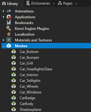 - In the Library Kanzi Studio places all resources from the imported file, such as Meshes, Splines, Animations, and Materials.