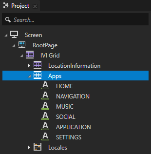 - Grid Layout 2D node named IVI Grid positions the application user interface elements. When you adjust the layout for the right-to-left locales, the grid layouts in the IVI Grid enable you to smoothly move elements between rows and columns keeping their absolute positions.