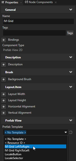 - Select the IVI Grid Prefab View 2D node, and in the Properties add and set the Prefab Template property to IVI Grid LeftToRight.