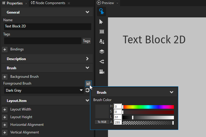 To quickly edit a brush, in the Properties next to the Background Brush or Foreground Brush property click