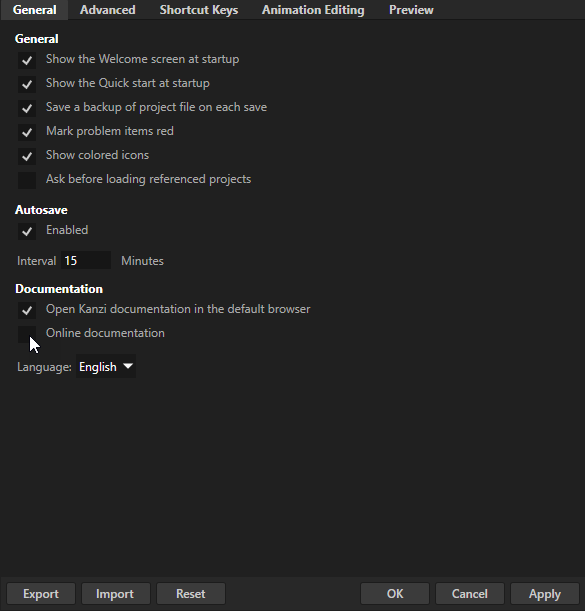 To view the Kanzi documentation when you are not connected to the Internet, in Kanzi Studio select > User Preferences and disable the Online documentation setting. When disabled Kanzi Studio uses the documentation installed in the <KanziWorkspace>/Documentation directory.