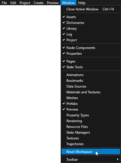 To restore the workspace to the default state, in the main menu select > Reset Workspace.
