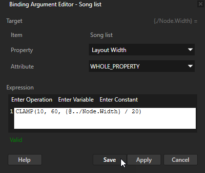 CLAMP(10, 60, {@../Node.Height} / 20)点击保存 (Save)。Clamp() 绑定函数限制Song list 节点的高度: