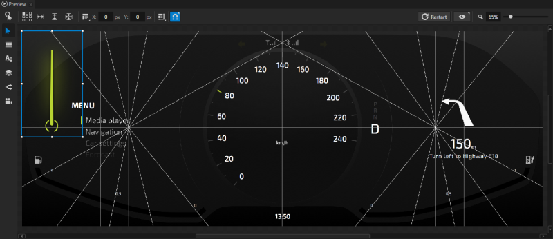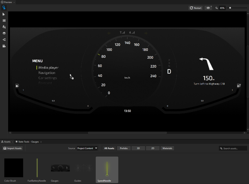 - 从 Kanzi Studio UI 底部的资产 (Assets) 拖动 SpeedNeedle 图像并将其放到预览 (Preview) 中的Gauges 上。