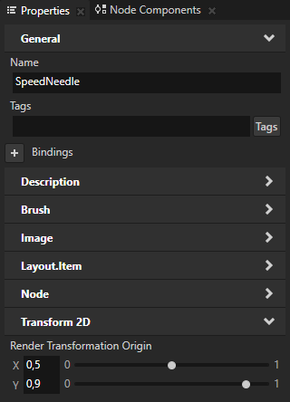 - 在工程 (Project) 中选择 SpeedNeedle,在属性 (Properties) 中右键点击,选择添加属性 (Add Property) > 2D 变换 (Transform 2D) > 渲染变换原点 (Render Transformation Origin) 并设置:在 Kanzi 中,所有 2D 节点的原点默认位于节点的左上角。 由于您要绕指针底部中心旋转指针,必须使用渲染变换原点 (Render Transformation Origin) 将中心点放在那里。