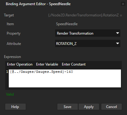 例如,要添加 Gauges 节点的 Speed 属性,在工程 (Project) 中选择 Gauges 节点,从属性 (Properties) 拖动 Speed 属性到绑定参数编辑器 (Binding Argument Editor) 中的表达式 (Expression) 字段。