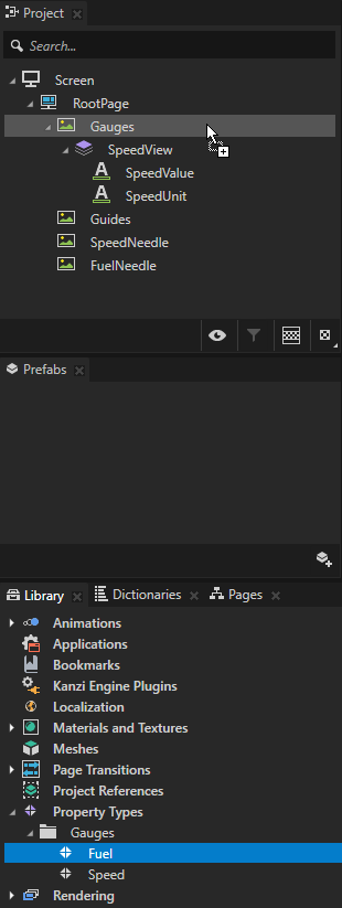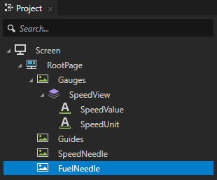 - 在 工程 (Project) 中拖动 FuelNeedle 节点并将其放到Gauges 节点上方。