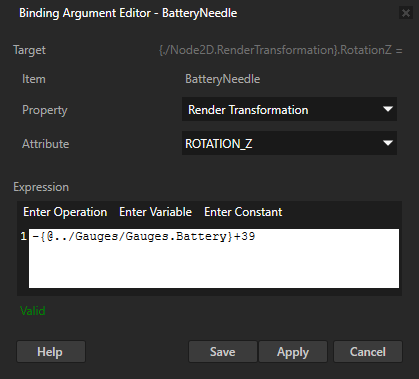 添加 绑定 (Bindings) 属性,并在绑定参数编辑器 (Binding Argument Editor) 中设置:使用绑定,您可以通过您在上一步骤中添加到Gauges 节点的Fuel 属性控制 FuelNeedle 节点绕 z 轴旋转。