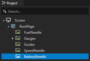 - 在 工程 (Project) 中拖动 BatteryNeedle 节点并将其放到Gauges 节点上方。