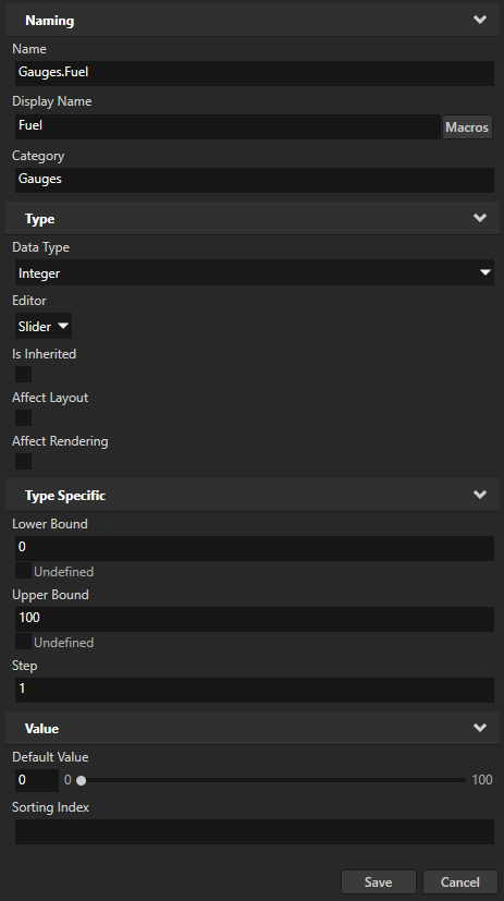 - 在工程 (Project) 中选择Gauges 节点,并在属性 (Properties) 中添加Fuel 属性。