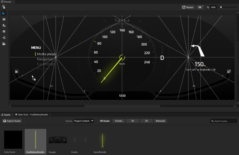 Gauges 节点具有Fuel 和Battery 仪表的透明开口,您可在其中查看指针位置。工程 (Project) 中的节点位置定义节点的渲染顺序:首先渲染显示在工程 (Project) 中场景图顶部的节点,最后渲染场景图底部的最后一个节点。通过将 FuelNeedle 节点放在Gauges 上方,Kanzi 首先渲染 FuelNeedle 节点,然后在其顶部渲染Gauges 节点,仅显示一小部分 FuelNeedle,以创建简洁的燃油指示器。