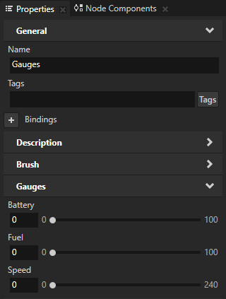 现在您可以使用Gauges 节点中的Speed、Fuel 和Battery 属性控制速度、燃油和电池仪表指针。