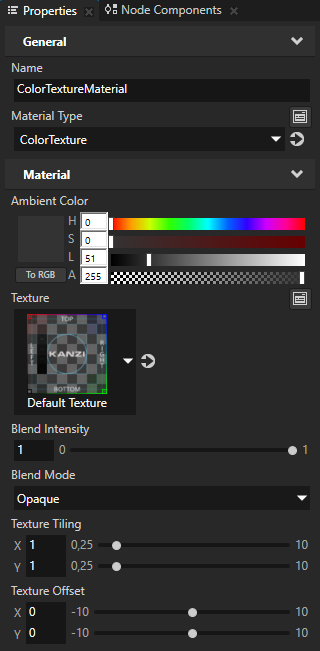 例如,要更改节点材质的环境颜色、纹理和混合,请添加并设置环境颜色 (Ambient Color)、纹理 (Texture) 和混合模式 (Blend Mode) 属性。