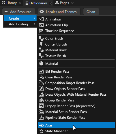 - 在字典 (Dictionaries) 中选择要添加别名的资源字典,点击+ 添加资源 (+ Add Resource),选择创建 (Create) > 别名 (Alias) 并重命名该别名。