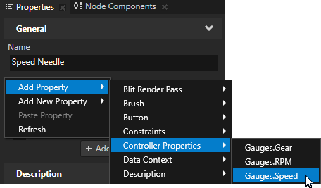 4. 属性 (Properties) 中,右键点击并选择添加属性 (Add Property) > 控制器属性 (Controller Properties) > Gauges.Speed