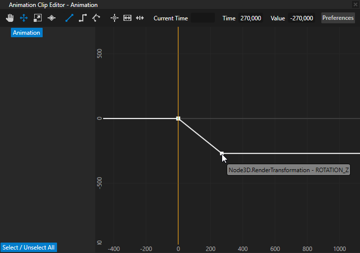 在属性驱动的动画中,您可以使用值 (Value) 属性控制在动画中设置的属性的值。在本例中,您将控制Node3D.RenderTransformation 属性的旋转 Z (Rotation Z) 属性字段的值。