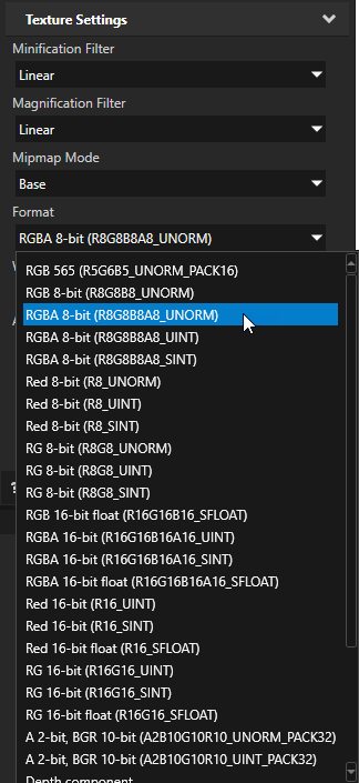 3. 属性 (Properties)纹理设置 (Texture Settings) 中,将 格式 (Format) 设为您要使用的目标像素格式。