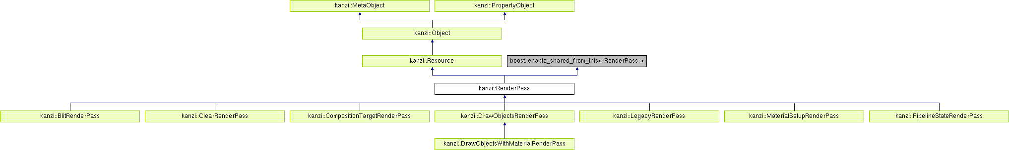 The base RenderPass class does not implement any functionality, but renders its descendant render passes. This is the reason why the base RenderPass class is called Group Render Pass in Kanzi Studio. All other render passes either perform draw operations or set the state for successive render passes. In both cases, they pass the control to their descendant render passes only after they execute their own operations. Keep this in mind when you define your own render passes. See Creating your own render pass.