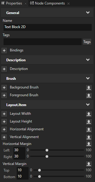 You set the margins of the Text Block 2D node to position the locale buttons in the application interface. - In the Prefabs select the Text Block 2D node and in the Properties next to the Text property click