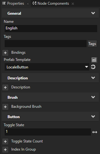 - In the Project select the instance of the LocaleButton prefab which sets the English locale, in the Properties add the Toggle State property and set it to 1.