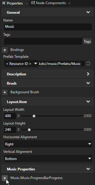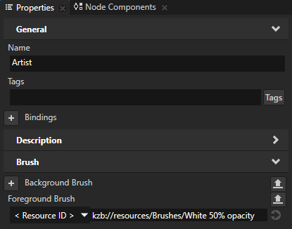 - To use a resource, in the Project select the node where you want to use the resource, in the Properties set the property where you want to use the resource to <ResourceID>, and enter the kzb file URL of the resource you want to use.