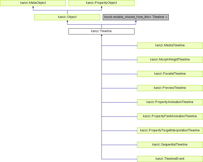 The Timeline class defines common properties which specify how the playback of a timeline is performed. These properties include timeline start time, content clip start time and clip duration, repeat count and so on. Actual classes inherited from the Timeline class define how animations are applied to the properties of objects. For an example of actual classes see PropertyAnimationTimeline, PropertyFieldAnimationTimeline or ParallelTimeline.