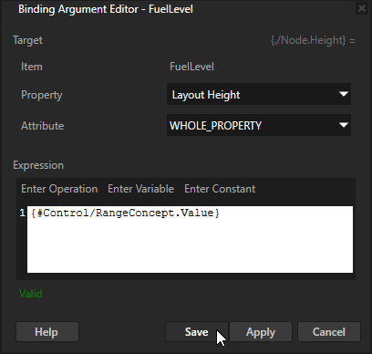 {#Control/RangeConcept.Value}With this binding you bind the Value property of the Control slider component to the Layout Height property of the fuel level indicator.