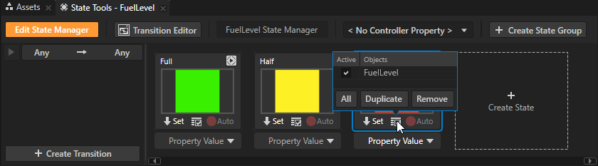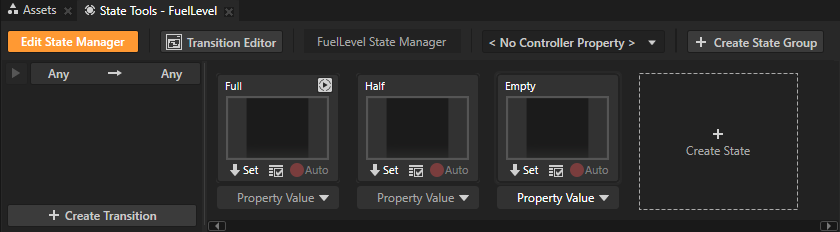 In this section you create a state manager with states that set how the fuel indicator looks when the level of fuel is full, half full, and empty. To indicate the amount of fuel, in each of the states you use one of the color brushes you created in the previous section.