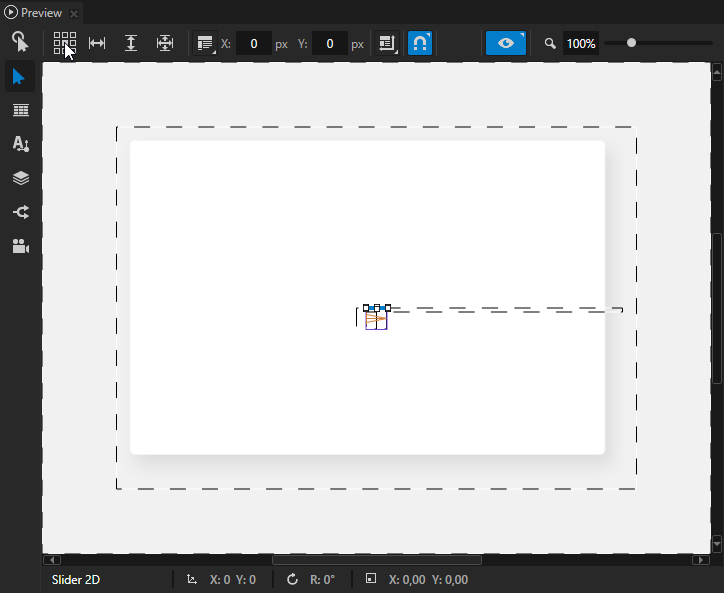 In the Project select the instantiated Slider 2D prefab, in the Preview select the Node tool and click the center square to align the Slider 2D prefab instance to the center of the Frame node.