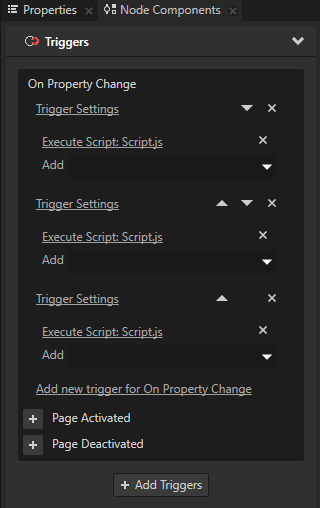 - Add two more triggers for On Property Change, from the first On Property Change trigger copy and paste the Execute Script action to each new trigger, and in the Trigger Settings Editor for those triggers set: