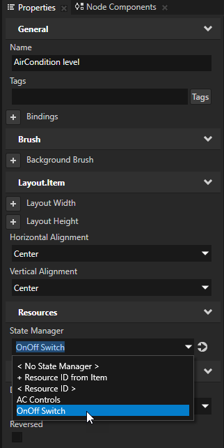 - In the Project select the AirCondition level node, in the Properties add the State Manager, and set it to OnOff Switch.