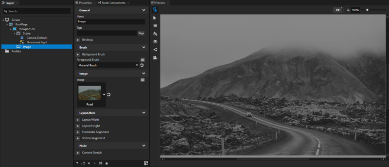 - Drag an image from the Assets and drop either in the Preview or any 2D node in the scene graph in the Project.