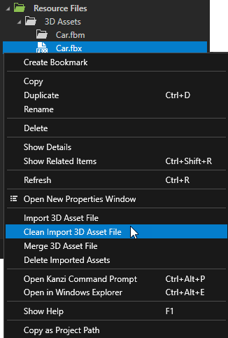 - In the Library > Resource Files > 3D Assets right-click your model and select Clean Import 3D Asset File.