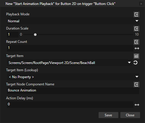 The values of the Playback Mode, Duration Scale, and Repeat Count options in the Start Animation Playback action override the values set in the Animation Player.