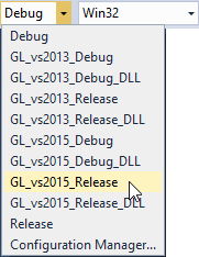 For example, select GL_vs2015_Release solution configuration.